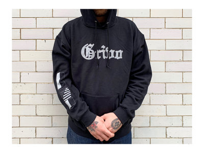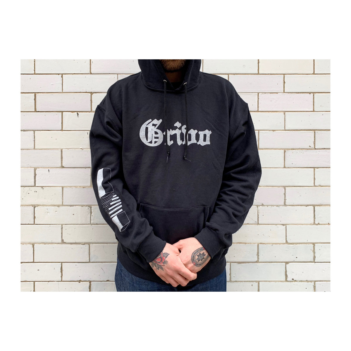 Chest and sleeve print on a black Jerzees Nublend hoodie.